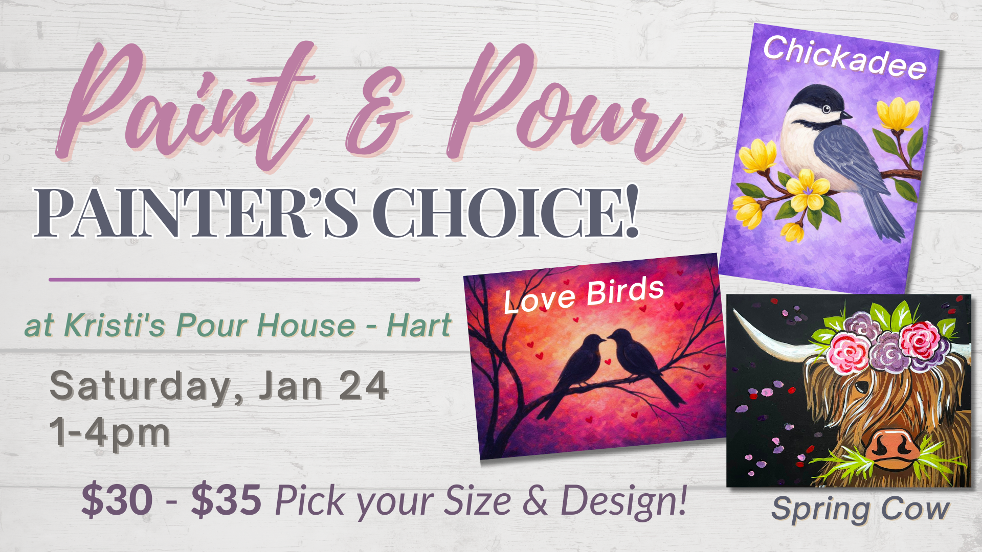 Join us at Kristi's Pour House in Hart for a FUN and creative afternoon! You will LOVE to see one of these beautiful spring themed paintings hanging in your home! There are THREE designs to choose from, plus two size & price options.